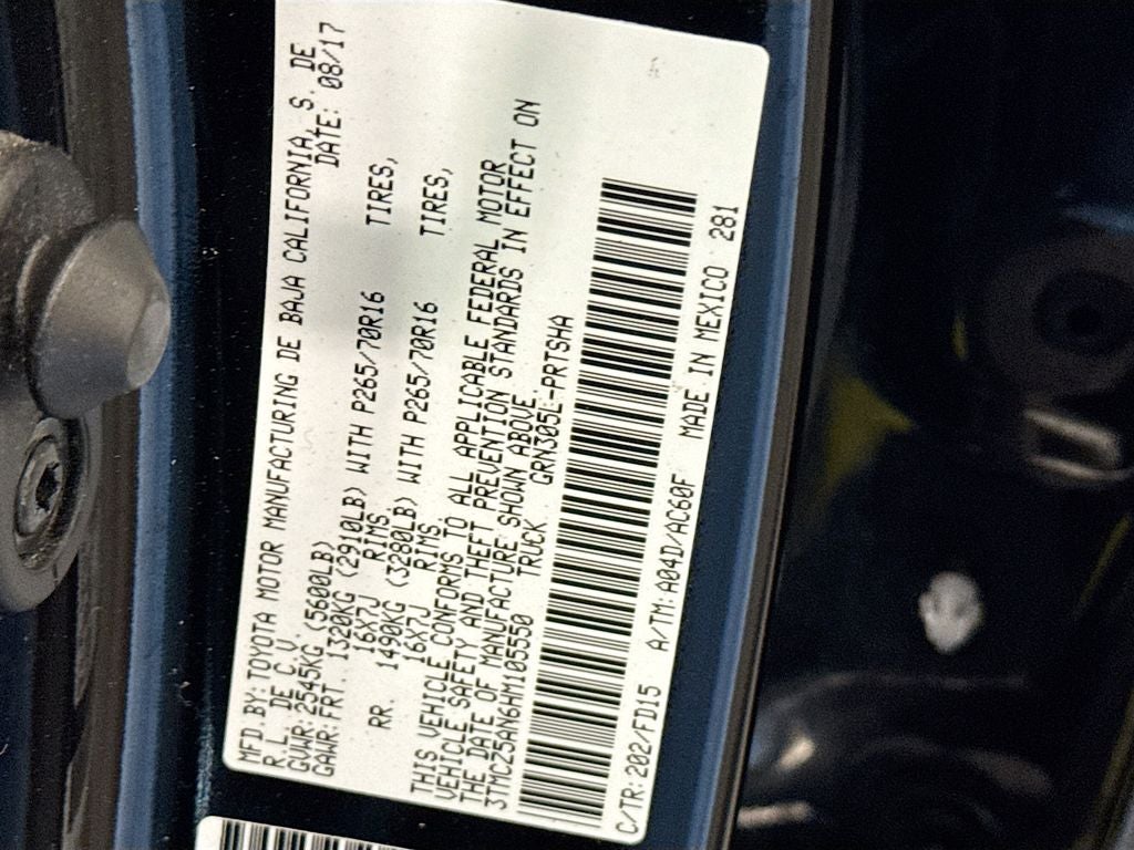 TRD Off Road Package: 16" X 7" Machined Contrast Alloy Wheels; Smartphone and Mobile Device Charger; Power Sliding Rear Window with Privacy Glass; Smart Key with Push Button Start; LED Daytime Running Lights; Cruise Control; ORP Black Overfenders; 120V/400W Deck Mounted AC Power; Variable Intermittent Wipers; TRD-Tuned Off-Road Suspension; Auto-Dimming Inside Rearview Mirror with Compass; Engine Immobilizer; P265/70R16 AS Tires; Wide Angle Front Fog Lamps. Premium and Technology Package: Color-Keyed Rear Bumper; Rear Parking Assist Sonar; Power Tilt/slide Moonroof; Dual Zone Automatic Climate Control; Lane Change Assist; Auto Headlights; Heated Front Seats; Blind Spot Monitor with Rear Cross Traffic Alert. Tow Package. All Weather Floor Liners and Door Sill Protectors. Alloy Wheel Locks. **Equipment listed is based on original vehicle build and subject to change. Please confirm the accuracy of the included equipment by calling the dealer prior to purchase.**