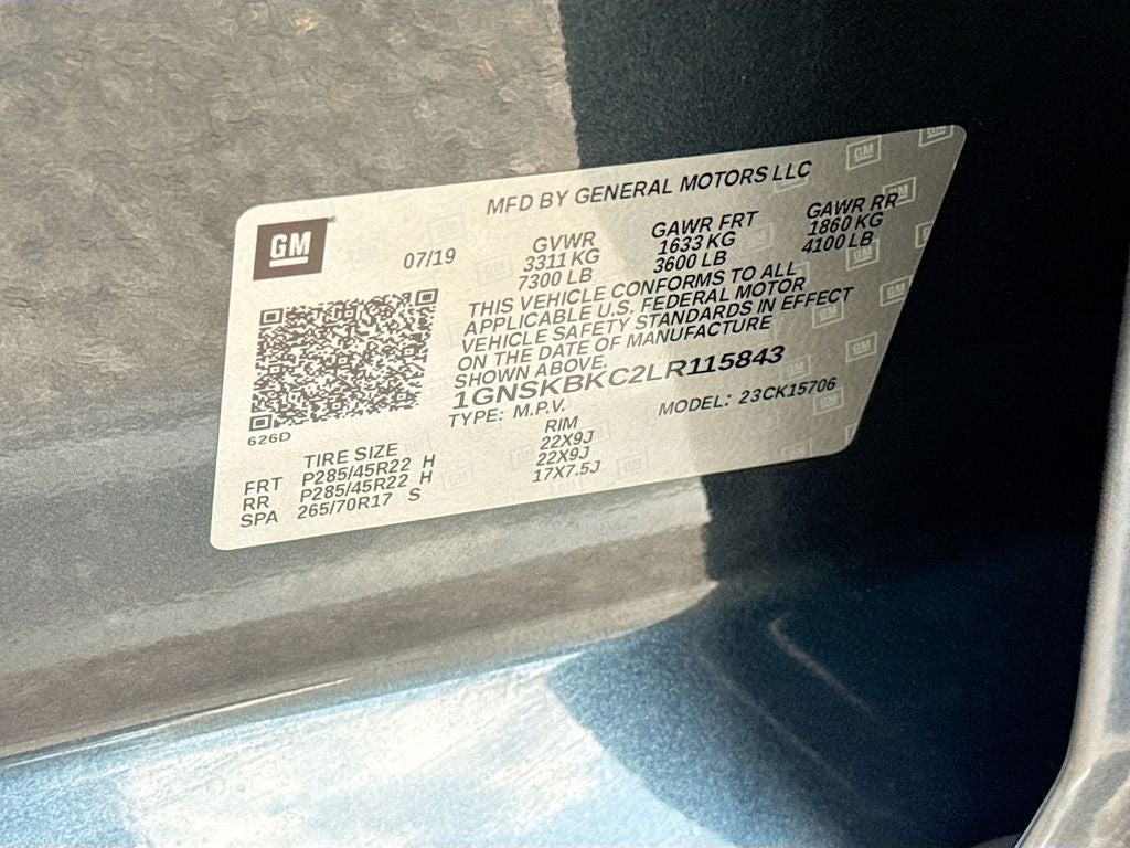 Sun. Entertainment and Destinations Package: Chevrolet Infotainment AM/FM Stereo with Navigation; Rear Seat Blu-Ray/DVD Entertainment System; Power Sunroof. Luxury Package: 2nd Row Power Release 60/40 Split Folding Bench Seat; Heated 2nd Row Outboard Seats; Hands Free Power Liftgate; Heated Leather Wrapped Steering Wheel; Memory Settings; 3rd Row 60/40 Power Fold Split-Bench; Front and Rear Park Assist; Power-Folding Heated Outside Mirrors; Lane Change Alert with Side Blind Zone Alert; Power Tilt and Telescopic Steering Column with Memory; Passive Entry System; Fog Lamps; Rear Cross Traffic Alert; Push Button Keyless Start. Preferred Equipment Group 1LT: Memory Settings; Leather-Appointed Seat Trim; Remote Vehicle Start; Power Liftgate; Rear Park Assist with Audible Warning; Floor Console; Front Passenger 6-Way Power Seat Adjuster; 7. 300 lbs (3. 311 Kgs) GVWR; Enhanced Driver Alert Package; Driver Inboard and Front Passenger Airbags; Premium Smooth Ride Suspension Package; Universal Home Remote; Color-Keyed Carpeting Floor Covering; Extended-Range Remote Keyless Entry; 2nd Row 60/40 Split-Folding Manual Bench; Bose Premium 9-Speaker System; 1st and 2nd Row Color-Keyed Carpeted Floor Mats; Front Heated Reclining Bucket Seats; Cargo Net; Electronic Cruise Control with Set and Resume Speed; 5 12-Volt Auxiliary Power Outlets; SiriusXM Radio; Single-Speed Elec Autotrac Active Transfer Case; Black Assist Steps; Leather-Wrapped Steering Wheel; Roof-Mounted Luggage Rack Side Rails; Auto-Dimming Inside Rearview Mirror; Power-Adjustable Accelerator and Brake Pedals; 3rd Row Manual 60/40 Split-Folding Fold Flat Bench; 4-Wheel Antilock Disc Brakes with Brake Assist. 22" Premium Painted Wheels with Chrome Inserts. Rear Seat Blu-Ray/DVD Entertainment System. Power Sunroof. Power Release 2nd Row Bucket Seats. Chevrolet Infotainment AM/FM Stereo with Navigation. Black Roof Rack Cross Rails. All-Weather Floor Mats. Set of 4 Wheel Locks. **Equipment listed is based on original vehicle build and subject to change. Please confirm the accuracy of the included equipment by calling the dealer prior to purchase.**